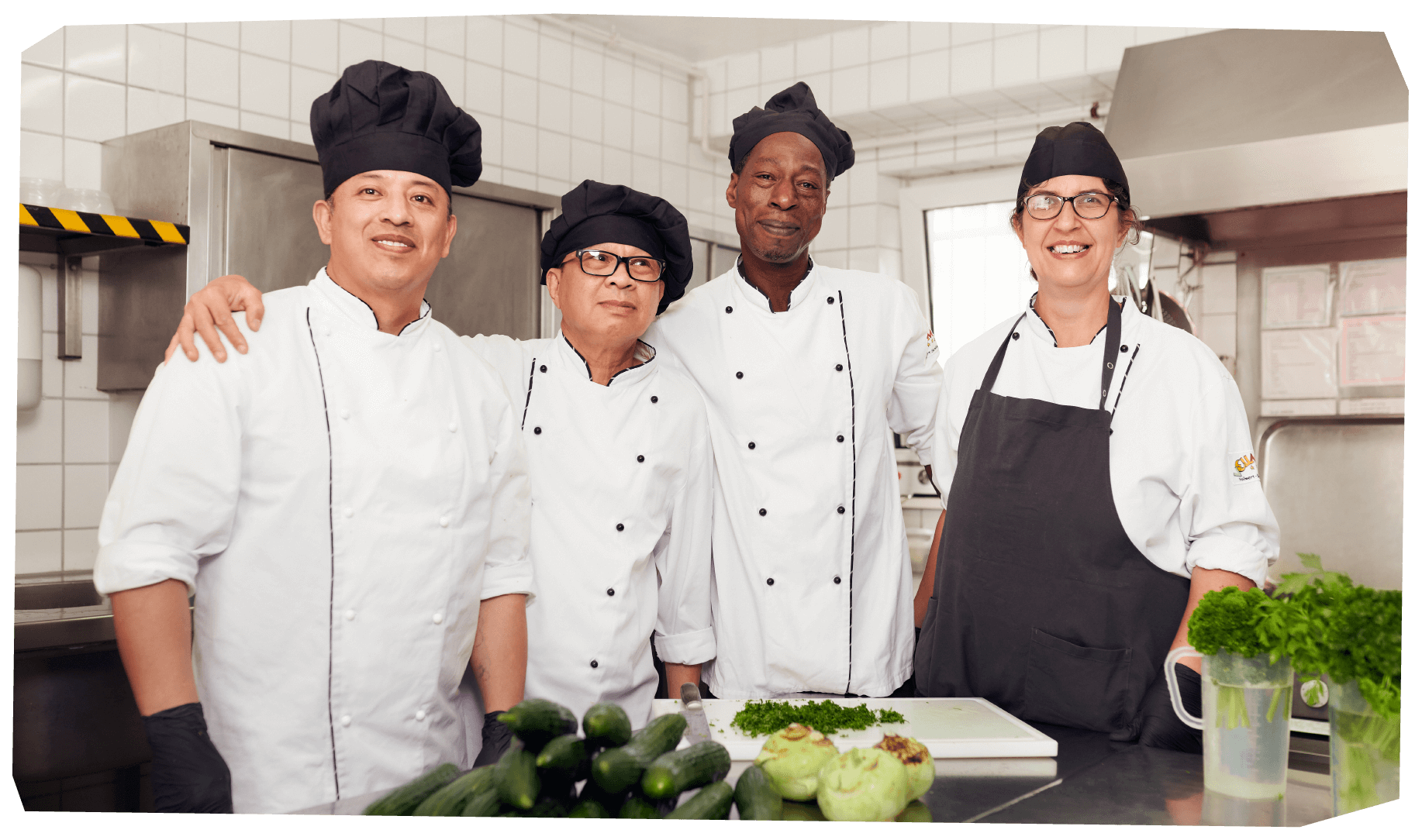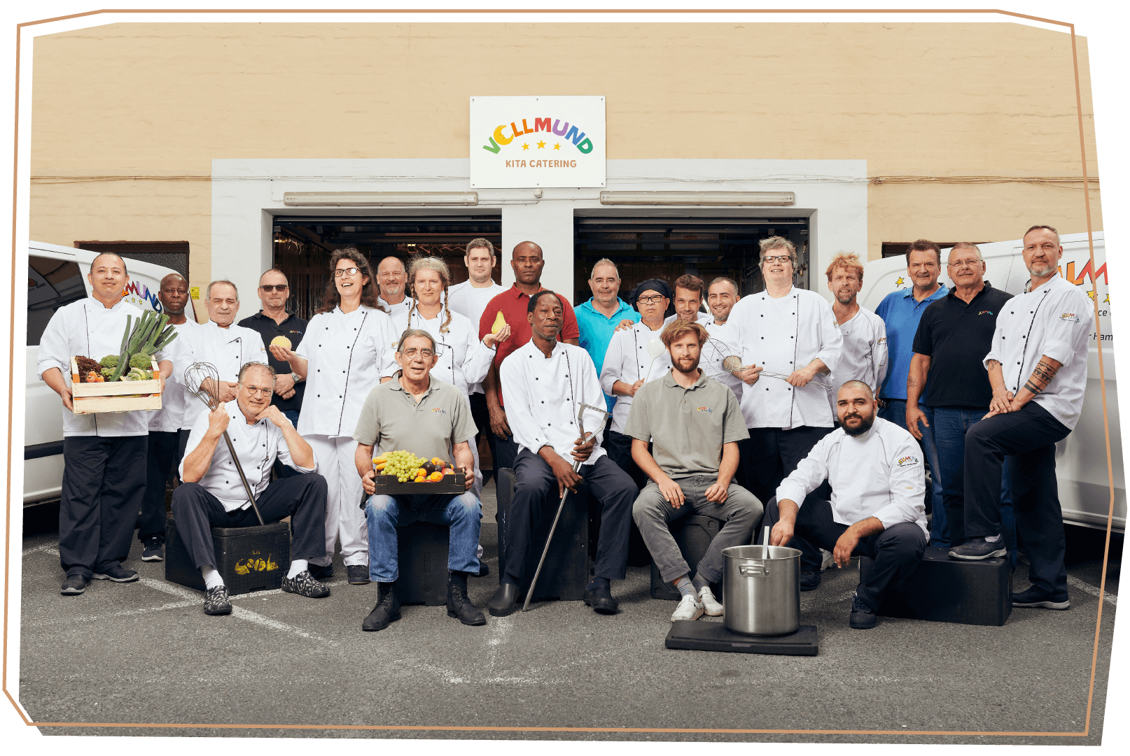 Das gesamte Team von VOLLMUND ist versammelt, um täglich Hamburgs Kindern gesundes Essen anzubieten.