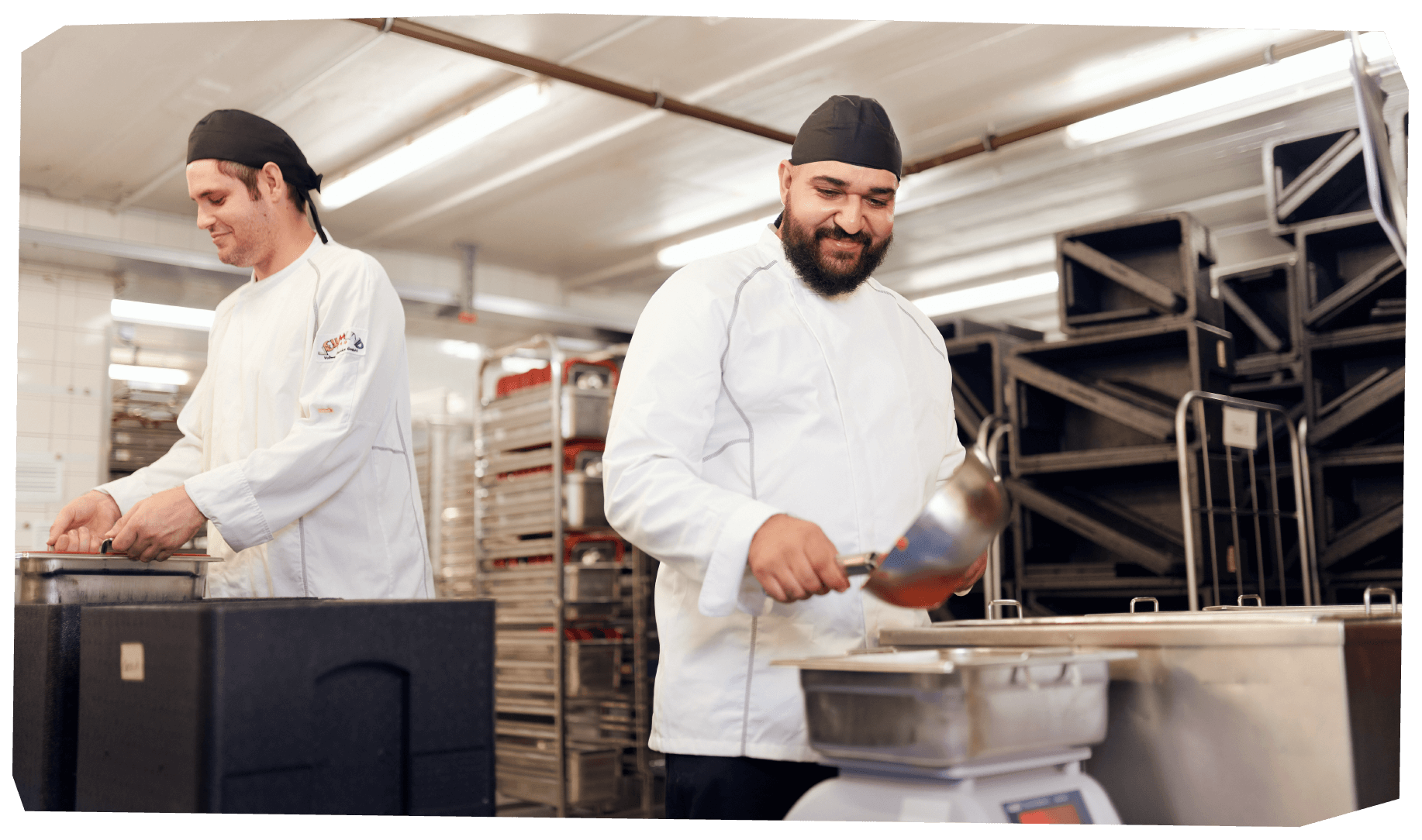 Wer hier im Team arbeitet, muss schneller sein als der eigene Schatten. Denn Ronny, Vincent, Mandy und Fabijan füllen innerhalb von wenigen Minuten die heißen Speisen in die passenden Behälter. Kalte Speisen brauchen Kühlpacks und werden wie die warmen Speisen in Isolierboxen verpackt. Alles drin? Dann raus zum Rolltor, wo die Fahrer-Flotte übernimmt. So sorgen unsere Verpackungskünstler:innen dafür, dass jeden Tag wirklich jedes Menü heiß und lecker bei unseren kleinen Kund:innen ankommt.