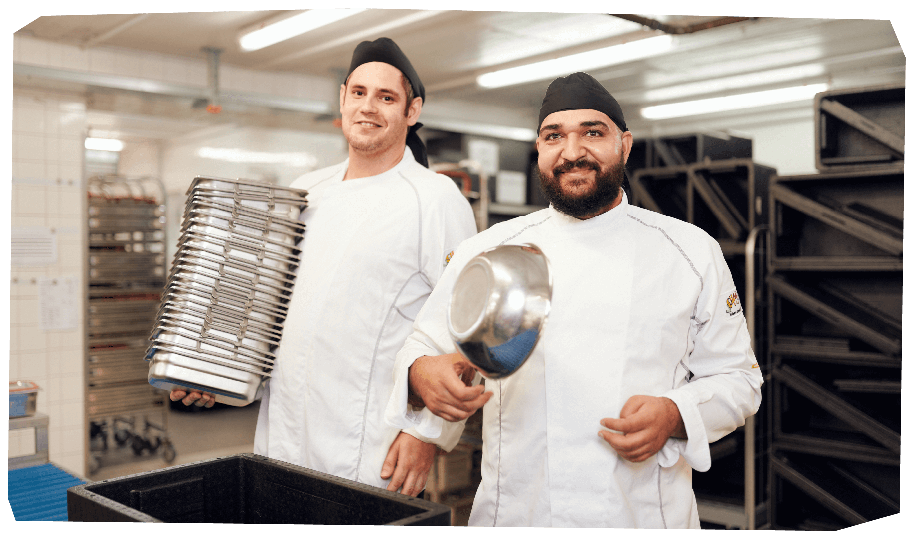 Wenn die Arbeit getan ist, ist es Zeit für einen wichtigen Job: unser Team Clean kommt zum Einsatz. Denn damit unsere Köch:innen jeden Tag saubere Arbeit leisten können, müssen Pfannen, Töpfe, Oberflächen und Co. gründlich gereinigt werden. Einige aus dem Team Clean machen das seit über 26 (!) Jahren. Und nur dank ihres wichtigen und anspruchsvollen Einsatzes können wir alle bei Vollmund glänzen.